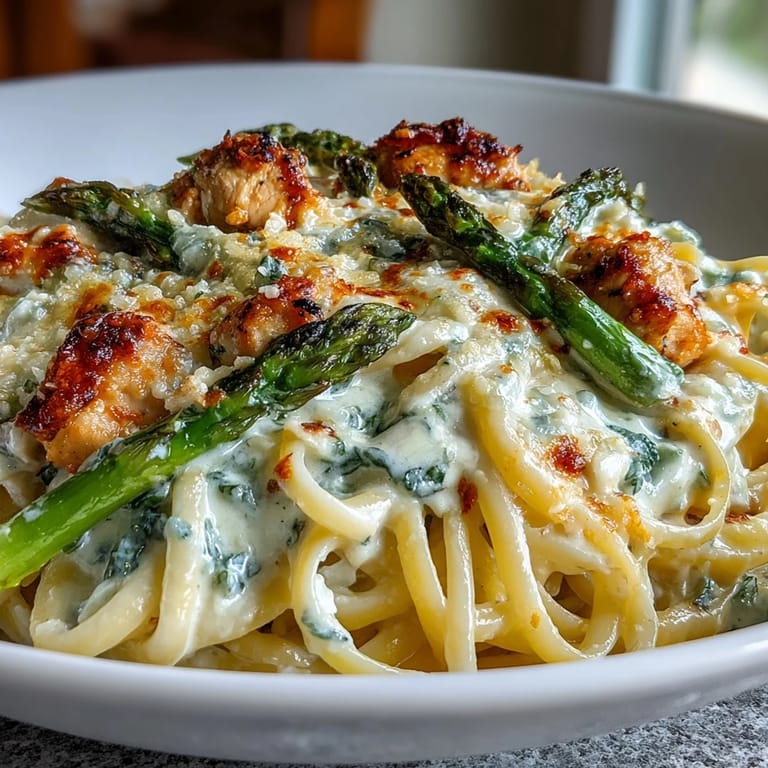 Save to Pinterest There's something about the smell of roasting asparagus with cheese that makes a weeknight feel like you're cooking in someone's Italian kitchen. I discovered this dish on a Tuesday when I had a block of Asiago sitting in the fridge, some chicken breasts that needed using, and absolutely zero inspiration. Twenty minutes later, my kitchen smelled incredible, and I realized I'd stumbled onto something that felt both elegant and effortless. The creamy sauce coats the linguine perfectly, the asparagus gets these crispy, golden edges, and the chicken stays tender because you're not overthinking it.