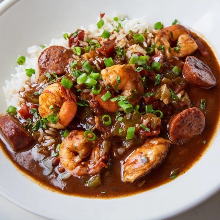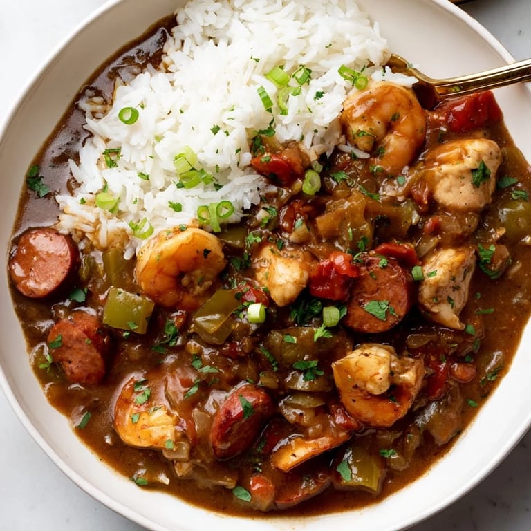 Gumbo reaches its peak flavor a day after making it; the spices and broth have time to meld and deepen. Serve it hot over fluffy white rice, garnished with scallions and parsley for brightness. It freezes beautifully for up to three months, making it perfect for nights when you want comfort without the work. Some people like hot sauce on the side for an extra kick, and I've learned that offering it alongside rather than stirring it in lets everyone find their own heat level.