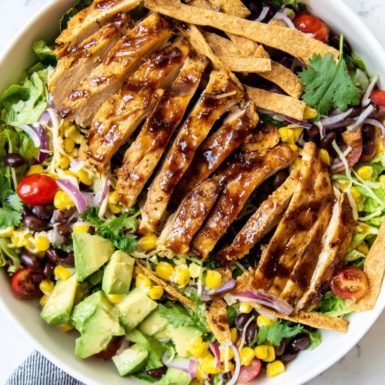 Prepare components separately: cook and refrigerate chicken, chop vegetables, and make dressing up to 1 day ahead. Assemble just before serving to keep lettuce crisp and toppings fresh. Store dressing separately to prevent sogginess.