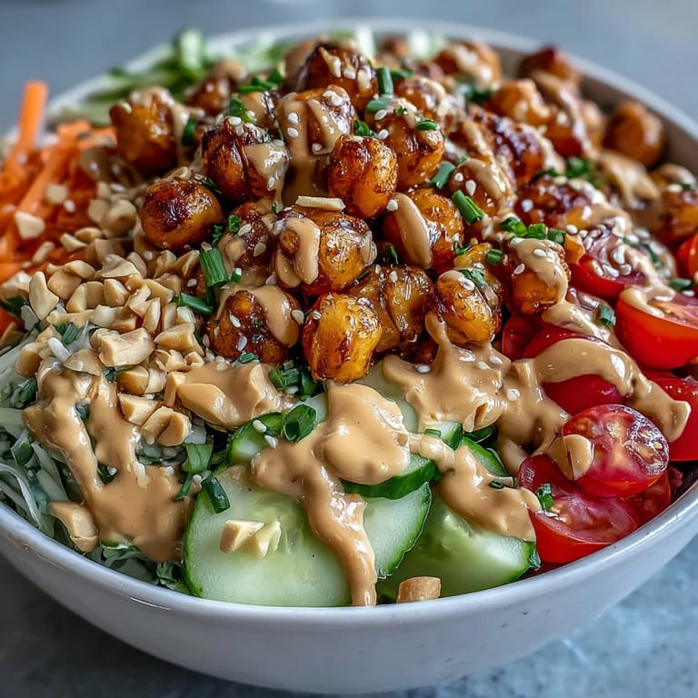 The genius of this bowl lies in how it brings together protein, fiber, and healthy fats without feeling heavy. The roasted chickpeas provide that satisfying heft that makes you feel full, while the raw vegetables keep everything bright and alive. The peanut sauce ties it all together with its creamy richness, making even simple ingredients feel intentional and complete. It's the kind of meal that makes you feel good on a cellular level—energized rather than sluggish—which is probably why I keep coming back to it.