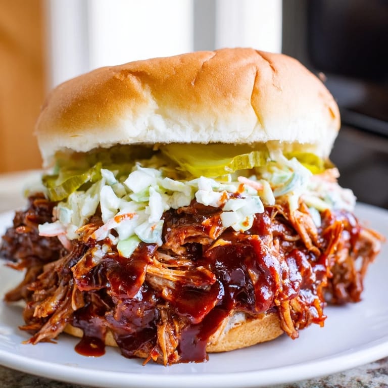 Serve on soft buns topped with extra barbecue sauce, coleslaw, and dill pickle slices for added texture and flavor.